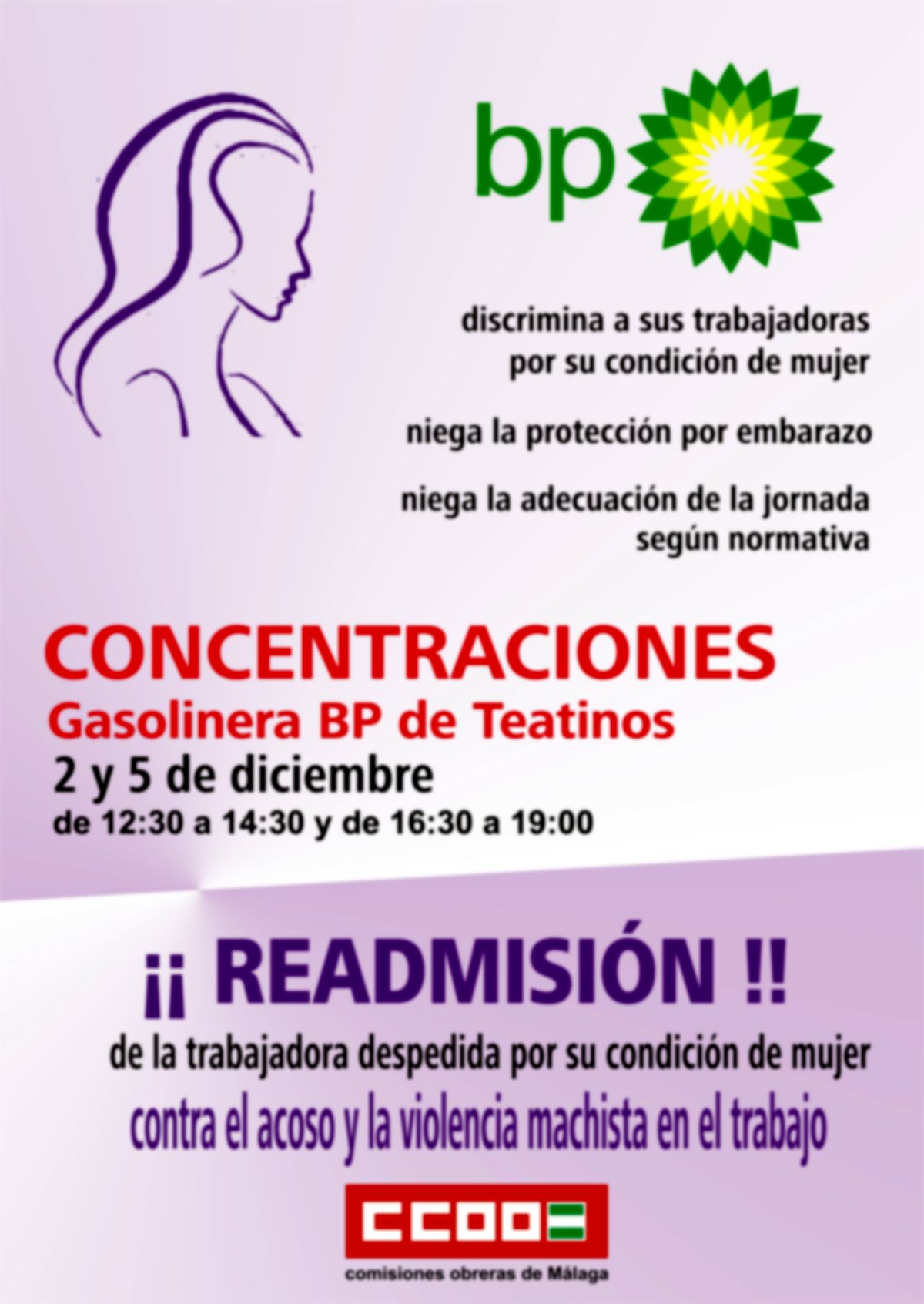 CCOO ha denunciado esta situación por “tratarse de una vulneración de los derechos de la trabajadora como mujer, como madre y como víctima de violencia de género” y llevará a cabo movilizaciones los días 2 y 5 de diciembre ante la gasolinera BP de Teatinos “para que la ciudadanía conozca lo que está pasando y la trabajadora sea readmitida”.
