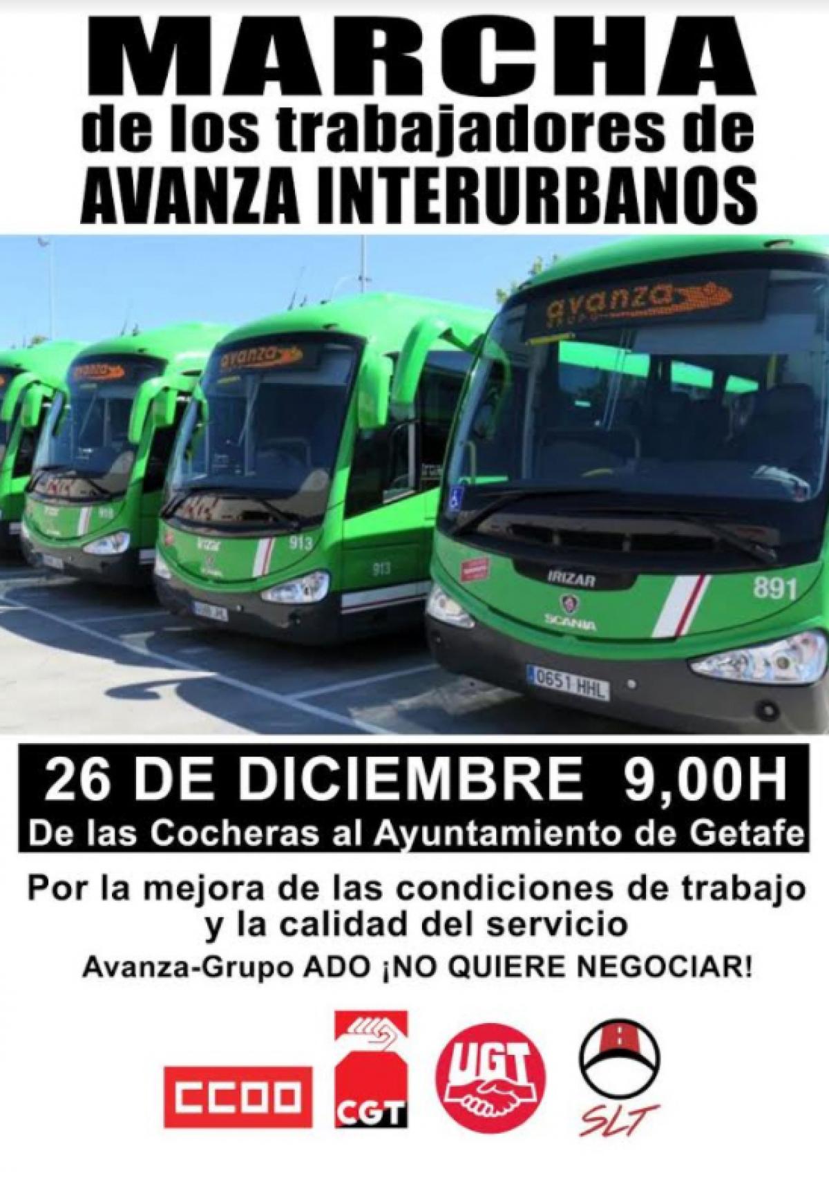 La plantilla de Avanza Interurbanos convoca una manifestación el próximo martes, 26 de diciembre, a las 9 horas, desde las cocheras de Avanza en Getafe hasta la plaza del Ayuntamiento de la misma localidad, para seguir reclamando mejoras en el servicio y en lo laboral.