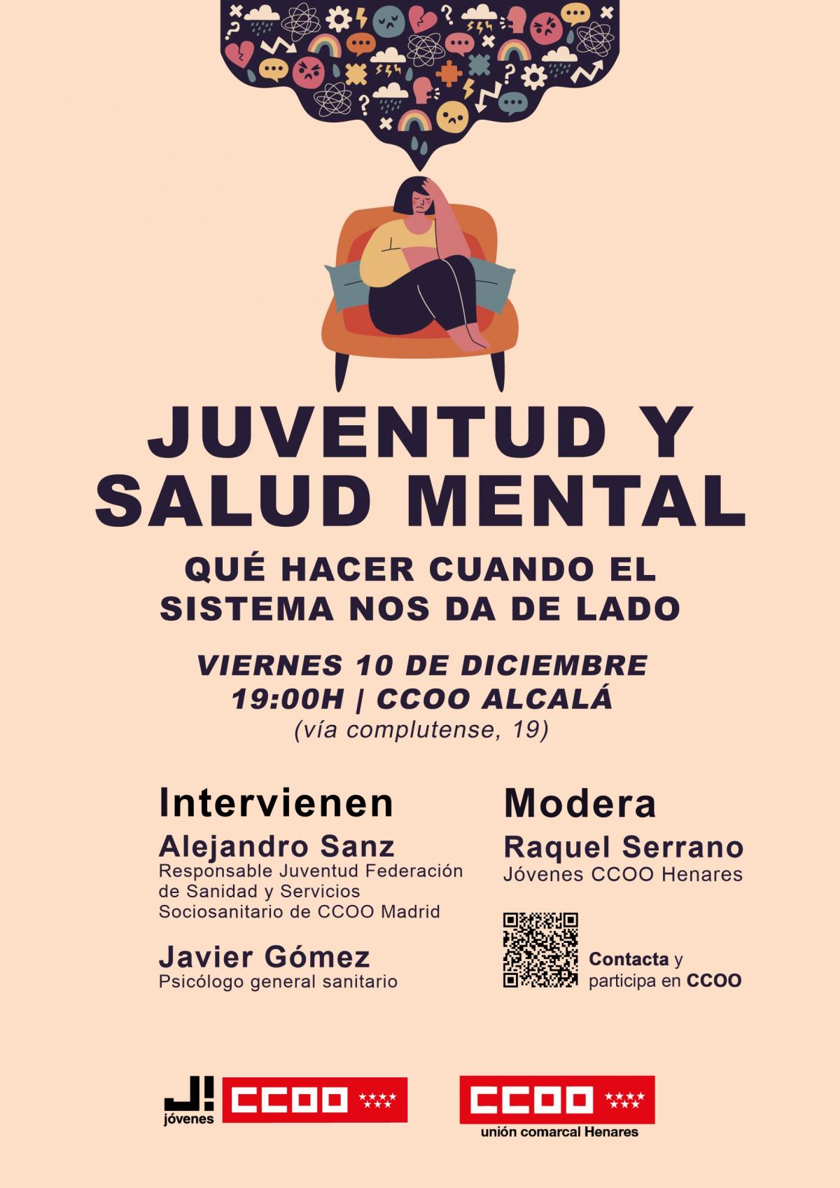 El próximo viernes, 10 de diciembre, a las 19 horas, se celebrará en la sede de Alcalá de Henares de CCOO (Vía Complutense, 19), un acto organizado por nuestro espacio joven, Jóvenes CCOO Henares, sobre salud mental y su afectación sobre la juventud trabajadora, bajo el título "Juventud y Salud Mental, qué hacer cuando el sistema nos da de lado".