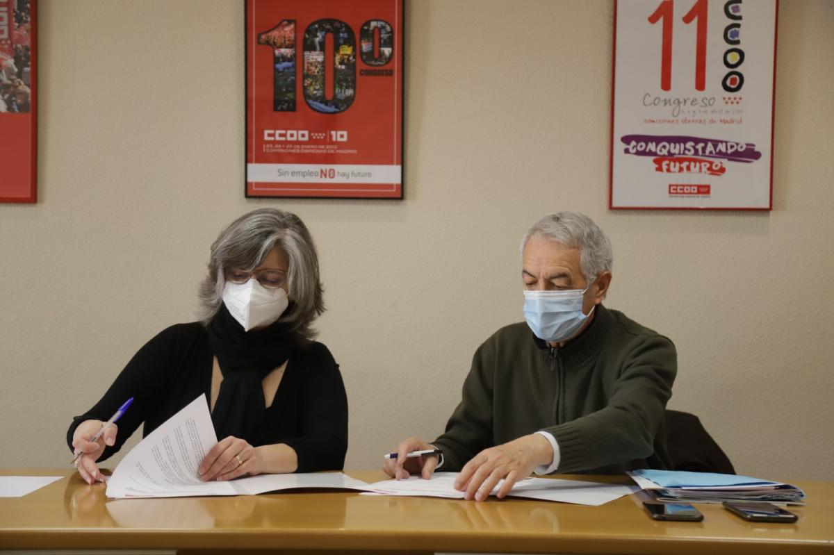 La secretaria general de CCOO de Madrid, Paloma López, y el presidente de la Asociación 11M, Eulogio Paz, han firmado el nuevo documento, por el que ambas organizaciones seguirán desarrollando actuaciones conjuntas para recordar a las víctimas y a sus familiares, y en pro de la justicia y la reparación.