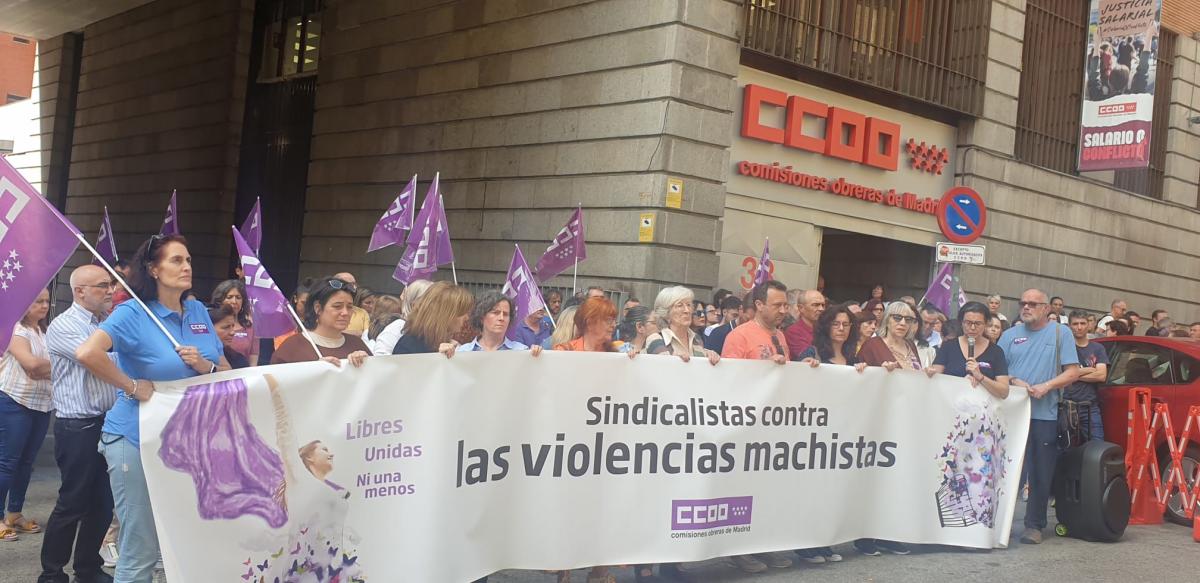 Las CCOO de Madrid se han concentrado este lunes en repulsa del último asesinato machista ocurrido en Cornellà este fin de semana. Un asesino machista le ha quitado la vida a puñaladas a su pareja, una mujer de 39 años, delante de su hijo de 2 años.