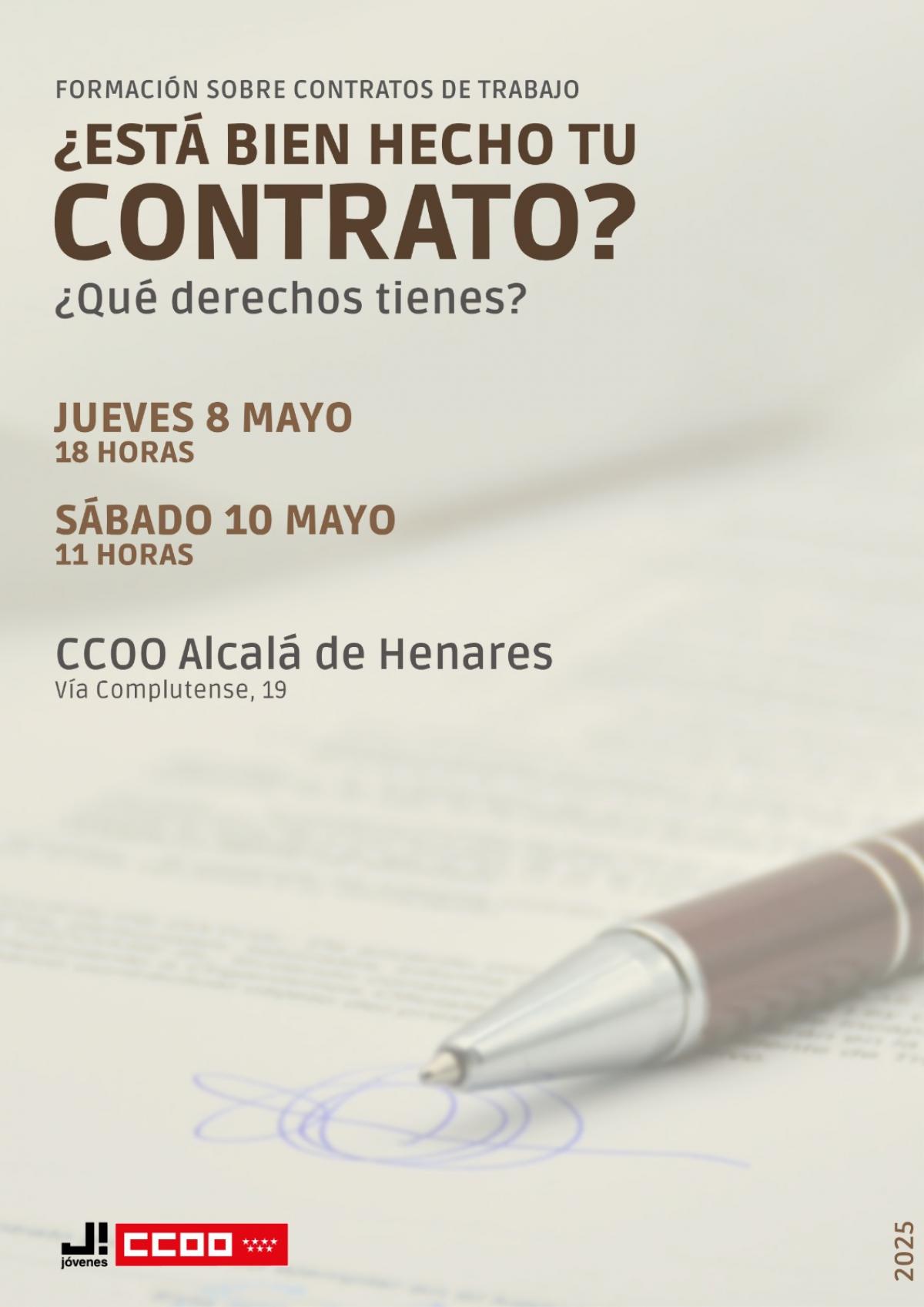 Por ellos se han organizado 2 nuevas sesiones formativas centradas en el contrato laboral, su forma y los distintos tipos de contratos que existen en España. Ambas sesiones tendrán lugar en la sede del sindicato de Alcalá de Henares y serán el jueves 8 de mayo a las 18:00h y el sábado 10 de mayo a las 11:00h.